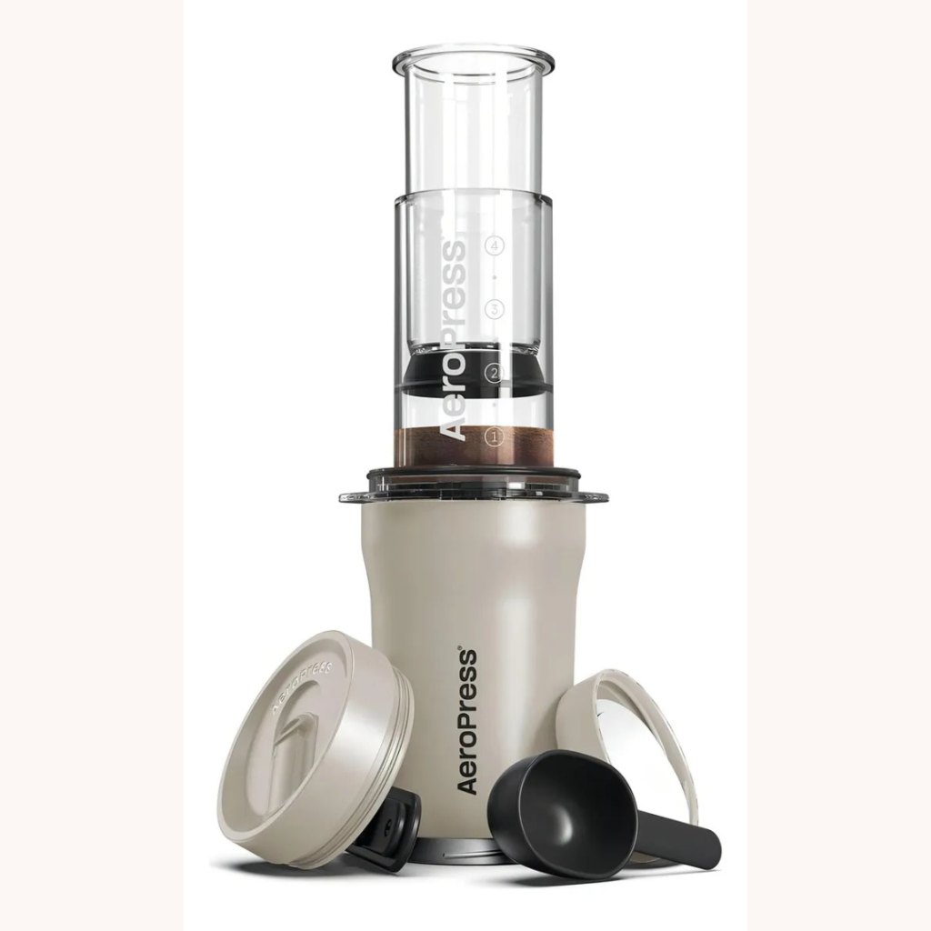 AeroPress Go Plus Cafetera Portátil 3 en 1 con Termo de Viaje de Acero Inoxidable – Gris