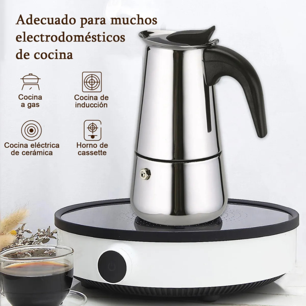 Cafetera Italiana Moka de Acero Inoxidable para 6 Tazas | Apta para Inducción y Estufa – Plateado
